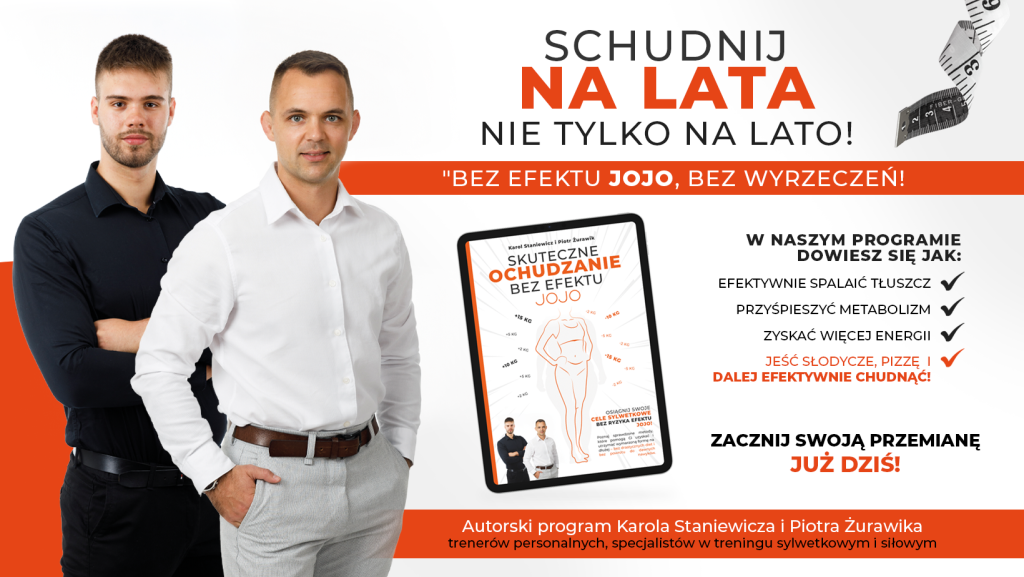 Skuteczne Odchudzanie Bez Efektu Jojo to autorski program Karola Staniewicza i Piotra Żurawika – trenerów personalnych, specjalistów w treningu sylwetkowym i siłowym. Program jest połączeniem wieloletniej praktyki zawodowej oraz najnowszych badań naukowych. 📚